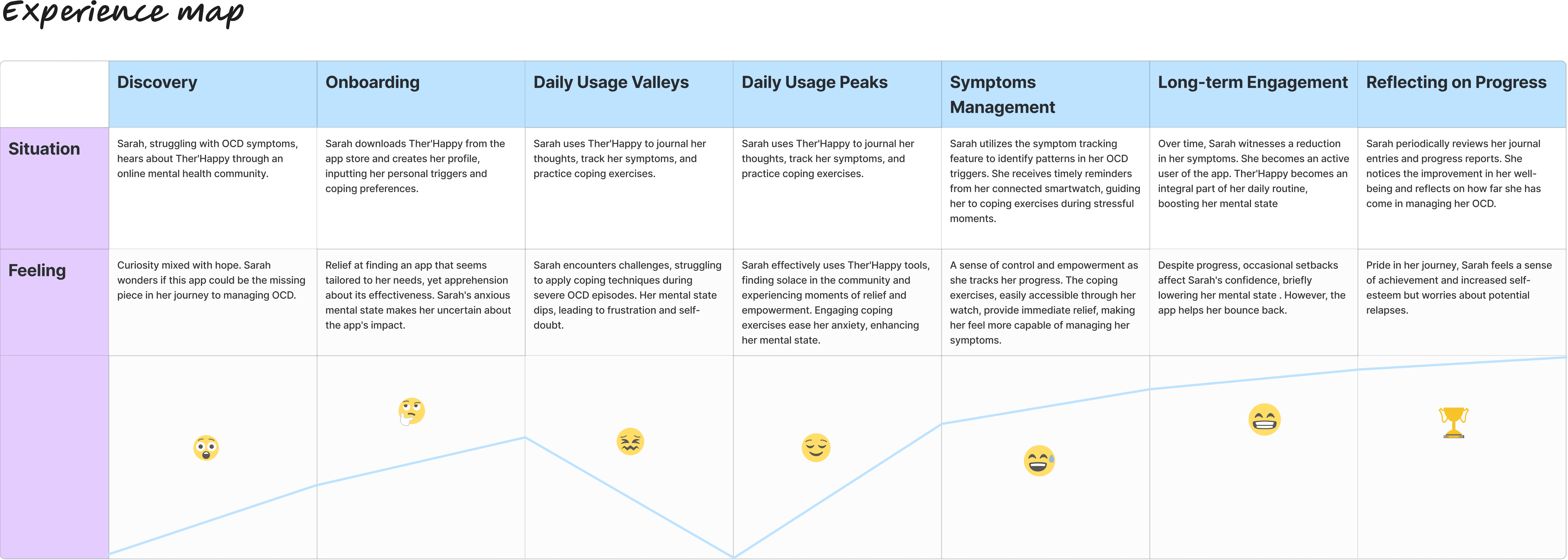 Experience Map: An experience map was generated to chart the journey of individuals with OCD, from the onset of symptoms to seeking help and managing their condition over time. This helped in identifying key touchpoints for the companion app.